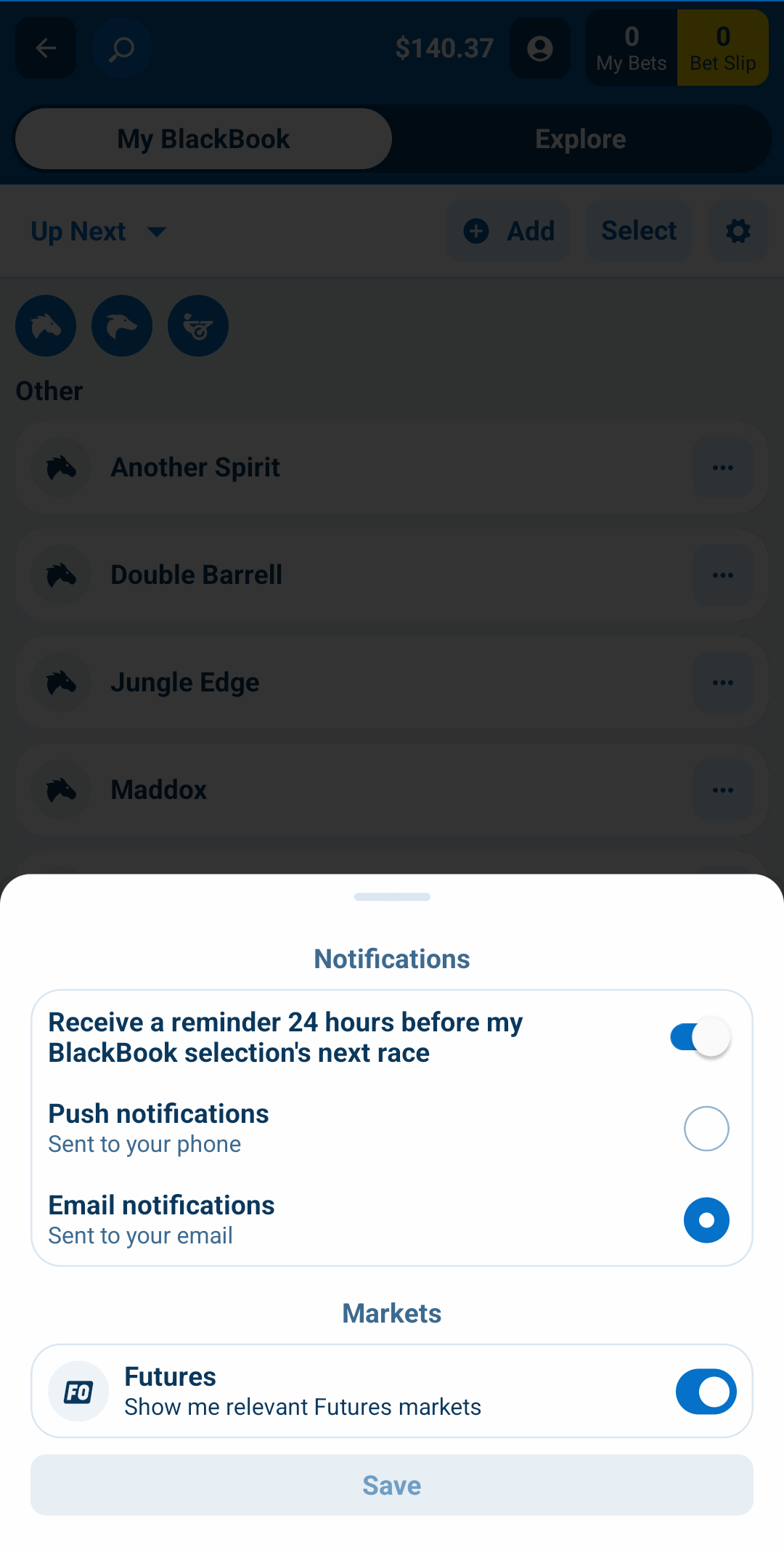 - Silence all BlackBook race reminders: Go to BlackBook settings to turn off all race reminders while keeping your other communications from Sportsbet
