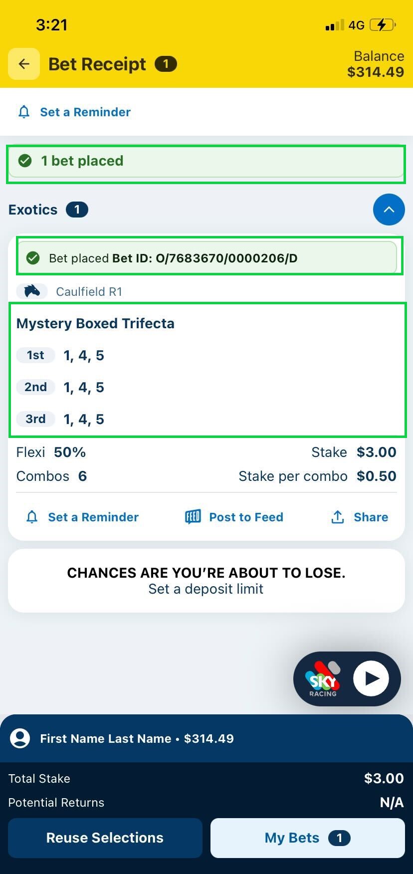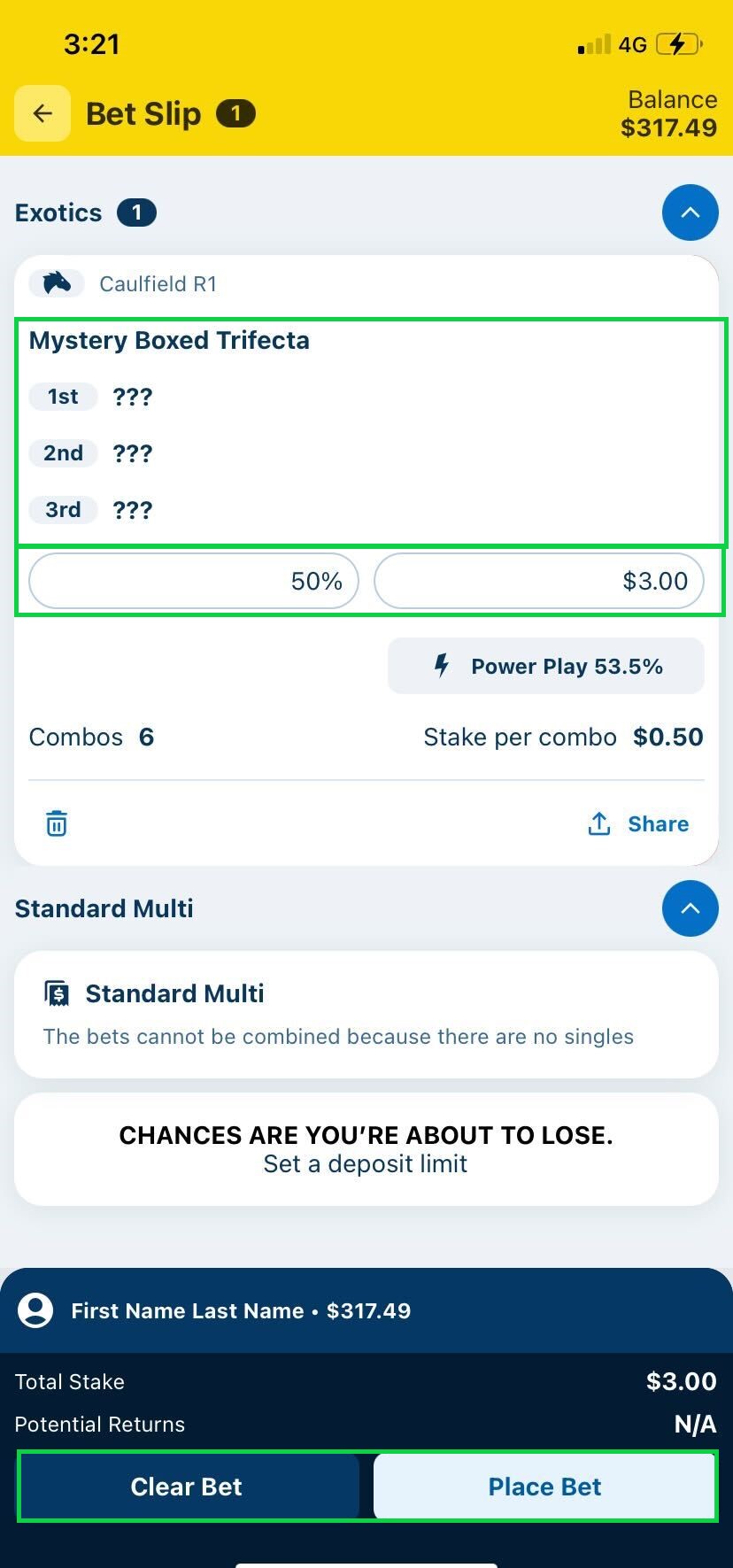Mystery bets are a type of bet that allows you to randomly combine a number of different selections for exotic markets in your bet slip. This includes being able to select either a trifecta, quinella, first 4 or exacta to place your mystery bet on. You will not be able to see your selections in a mystery until the bet has been confirmed.